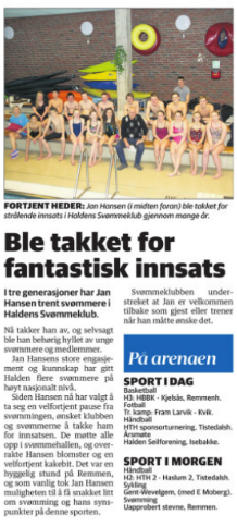 Det er mange av oss i Halden som har hatt den glede av å ha Jan Hansen som svømmetrener. I det siste har Jan ikke kunnet trene Halden svømmerne på grunn av forbud fra legen sin. Han har vært savnet. Derfor ville svømmerne som har Jan som trener nå og som har hatt Jan som trener vise sin takknemlighet ved å invitere han til en liten prat og en liten gave på Remmen mandag 10. mars. Det var en hyggelig stund på Remmen og som vanlig tok Jan muligheten til å få snakket litt om svømming og hans synspunkter på denne sporten som han har drevet med i to-tre generasjoner. Det som kjennetegner Jan Hansen er hans brennende engasjement og stå-på vilje. Men, i tillegg har han nå og har alltid hatt en utrolig forståelse for både svømmeteknikk og trenigsmetoder. En god del av Halden svømmerne i dag har foreldre som også hadde han som trener på 80 og 90 tallet så vi kjenner han godt. Så fra alle nåværende og tidligere svømmere ønsker vi i Haldens Svømmeklub å si tusen takk til deg Jan og god bedring. Håper du er tilbake på Remmen så snart som overhodet mulig!